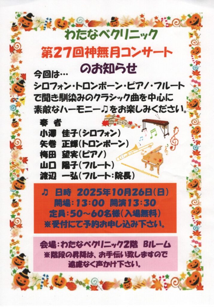 わたなべクリニック 第27回 神無月コンサートのお知らせ